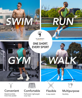 Hybrid Shorts: Perfect for training, swimming, or lounging, these versatile shorts feature compression liners, quick-dry fabrics, and secure zippered pockets.