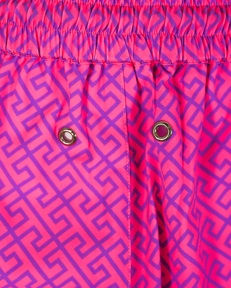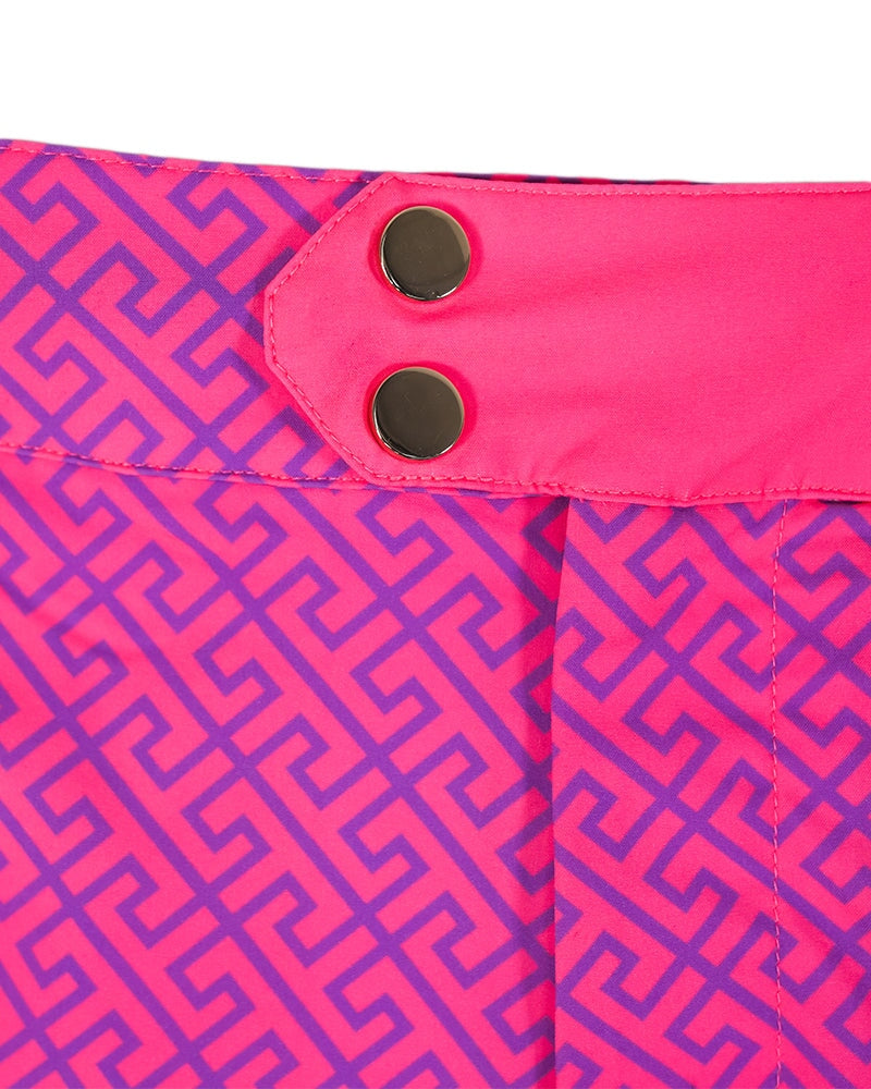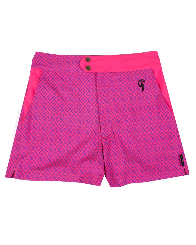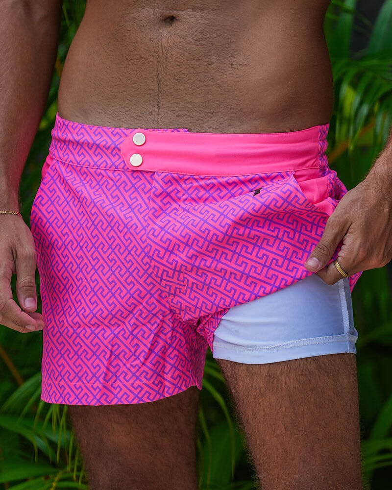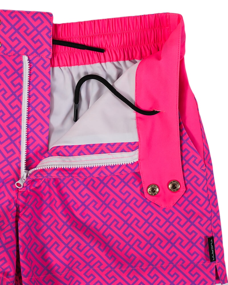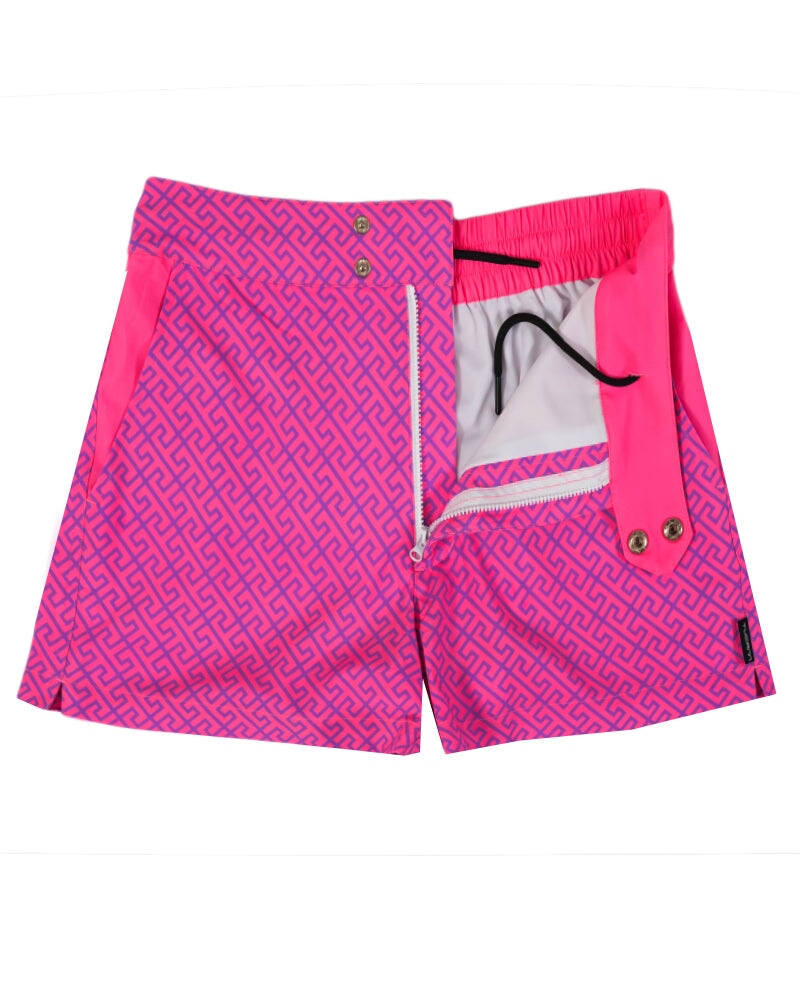 Stand out with our vibrant two-tone pink monogram T pattern, designed using premium Italian ink to achieve the richest color possible. Indulge in endless hours of comfort with our innovative chafe-free compression liner, ensuring you can relax in style. The dual front zip and button closure, along with hidden internal drawstrings and a half-elastic waistband at the back, guarantee the perfect fit every time.