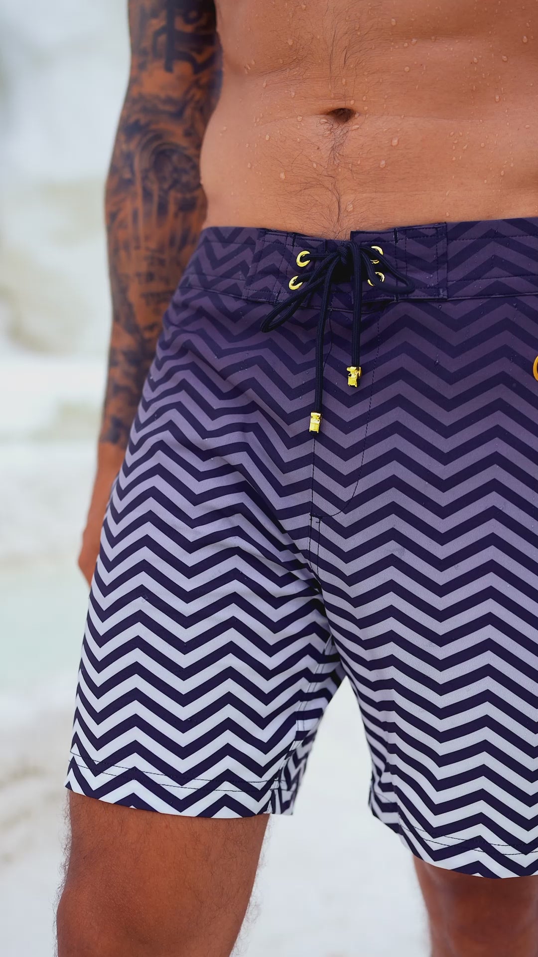 Turn heads with the effortless edge of our Onyx Vibe 7" Swim Trunks. Featuring a bold black-to-white zigzag fade, these classic swim trunks bring serious style without trying too hard. Whether you're lounging seaside or diving headfirst into summer, the 4-way stretch fabric moves with you, while the smart-fit waistband with drawstring closure ensures all-day comfort. Quick-drying, fade-proof Italian ink keeps your look sharp, and built-in air vents prevent ballooning in the water. The inner compression liner offers chafe-free support, and zipped pockets keep your essentials secure.