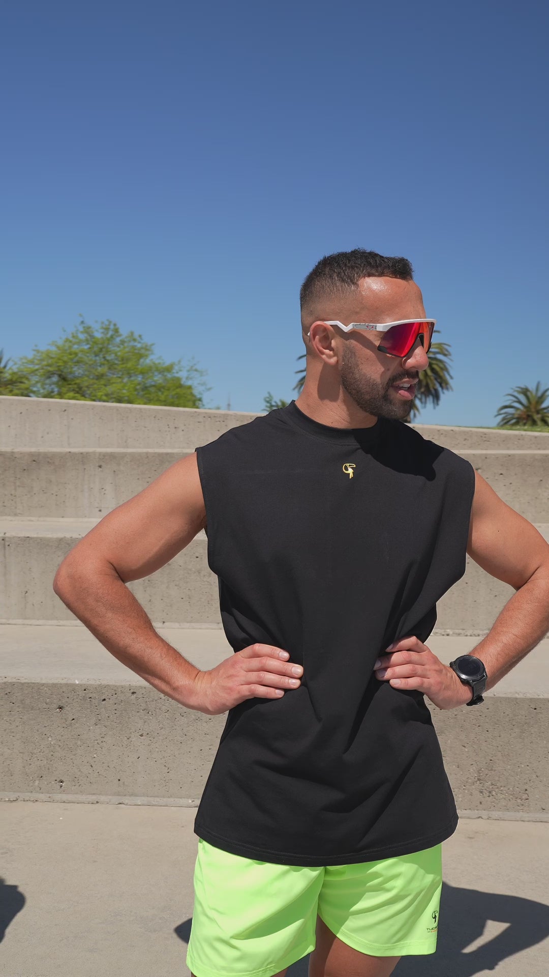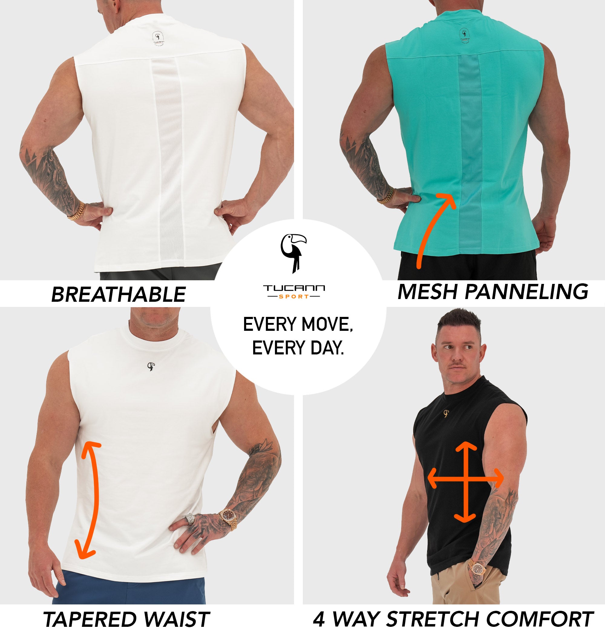 Introducing the Tucann Sport Sleeveless Tee in Black, a must-have for your everyday wardrobe. Tailored to enhance your figure, this men's sleeveless tee combines style and functionality for all your activities. Made from 4 way stretch, quick-drying fabric, it offers exceptional comfort and flexibility, allowing you to move freely, whether you're at the gym or enjoying a day out. The mesh panel at the back provides excellent ventilation and breathability, keeping you cool during intense activity or warm weather. With its sleek, modern design and flattering silhouette, the Tucann Sport Sleeveless Tee is your go-to choice for a classic and sporty look.